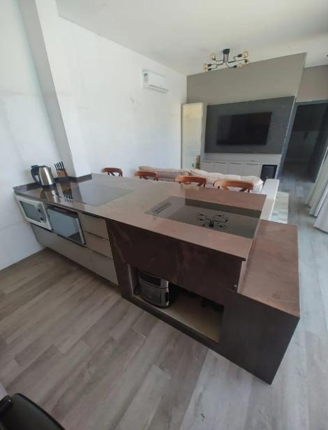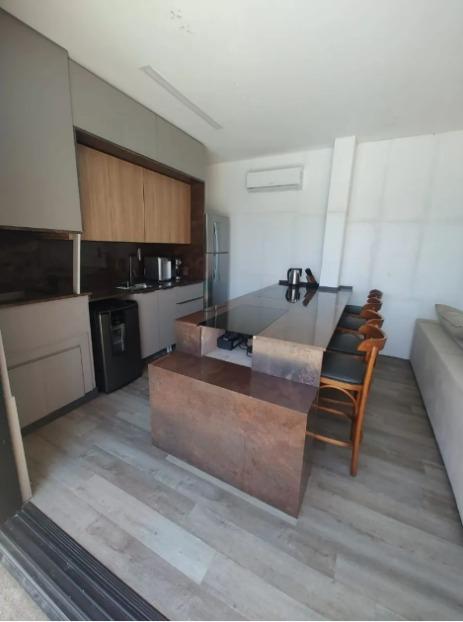 Cozinha, churrasqueira e fogão a lenha na área de lazer